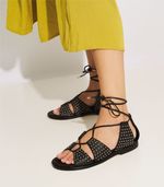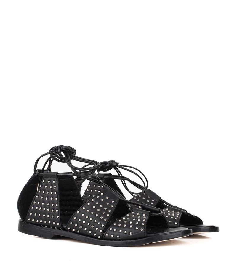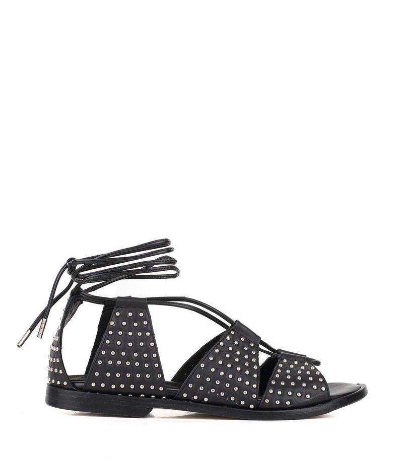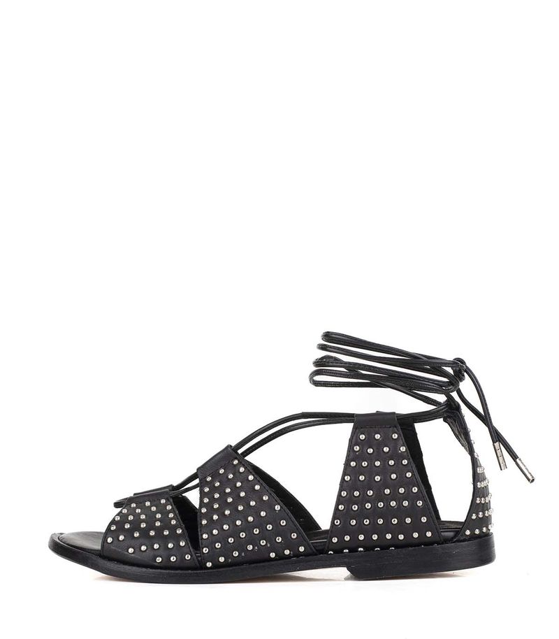 Sandalias estilo romanitas confeccionadas en cuero negro, adornadas con tachas que le aportan un toque rebelde y moderno. Su diseño envolvente y ajustable asegura comodidad y estilo, perfectas para realzar cualquier conjunto en días soleados. Ideales para un look urbano con actitud.