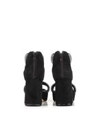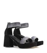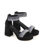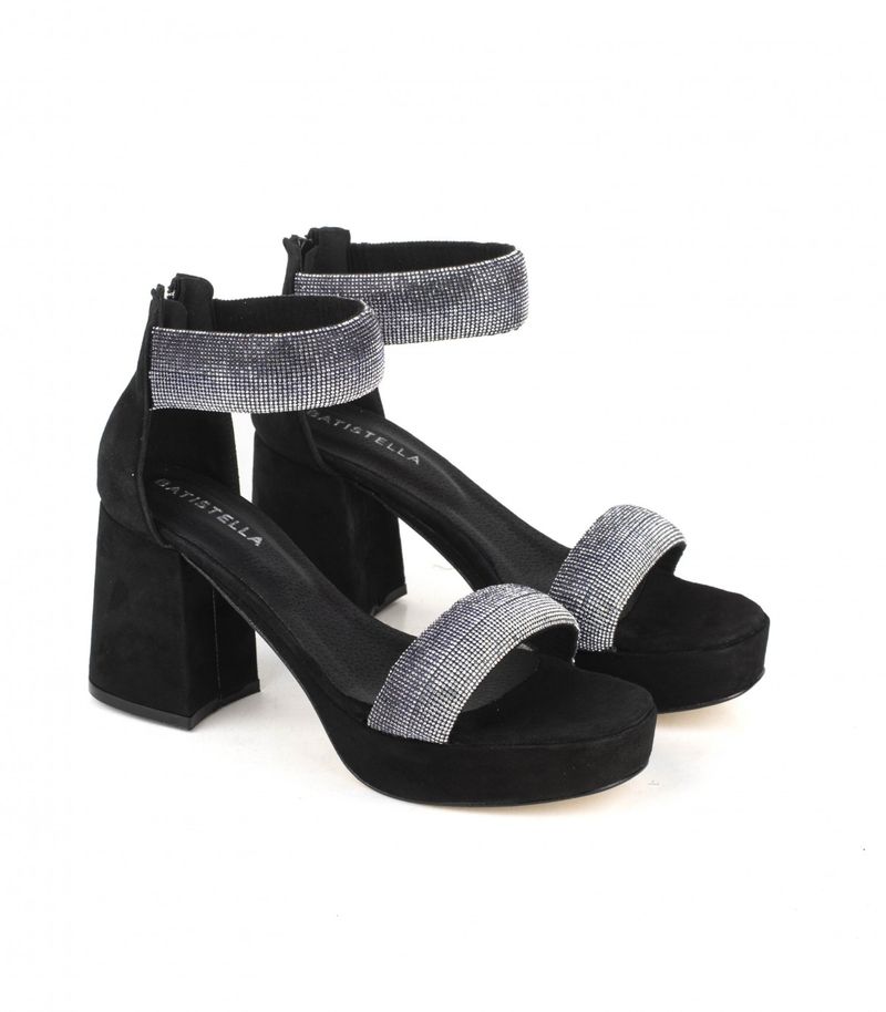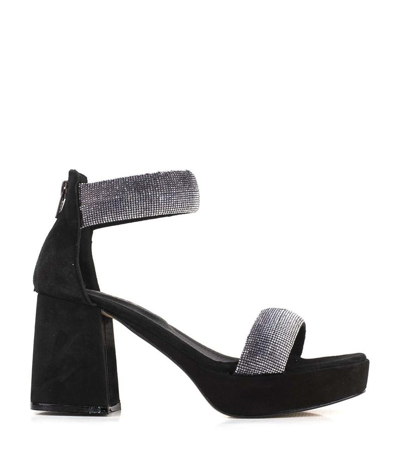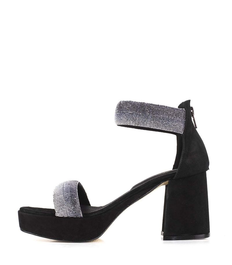 Sandalias de fiesta de gamuza negra con taco estilizado y detalles de strass, diseñadas para brillar en eventos especiales. Cuentan con talonera que aporta soporte, acceso con cierre trasero y un acabado elegante ideal para complementar cualquier look sofisticado.