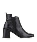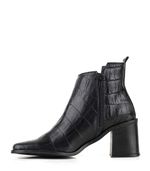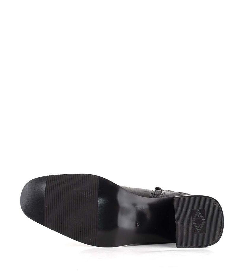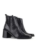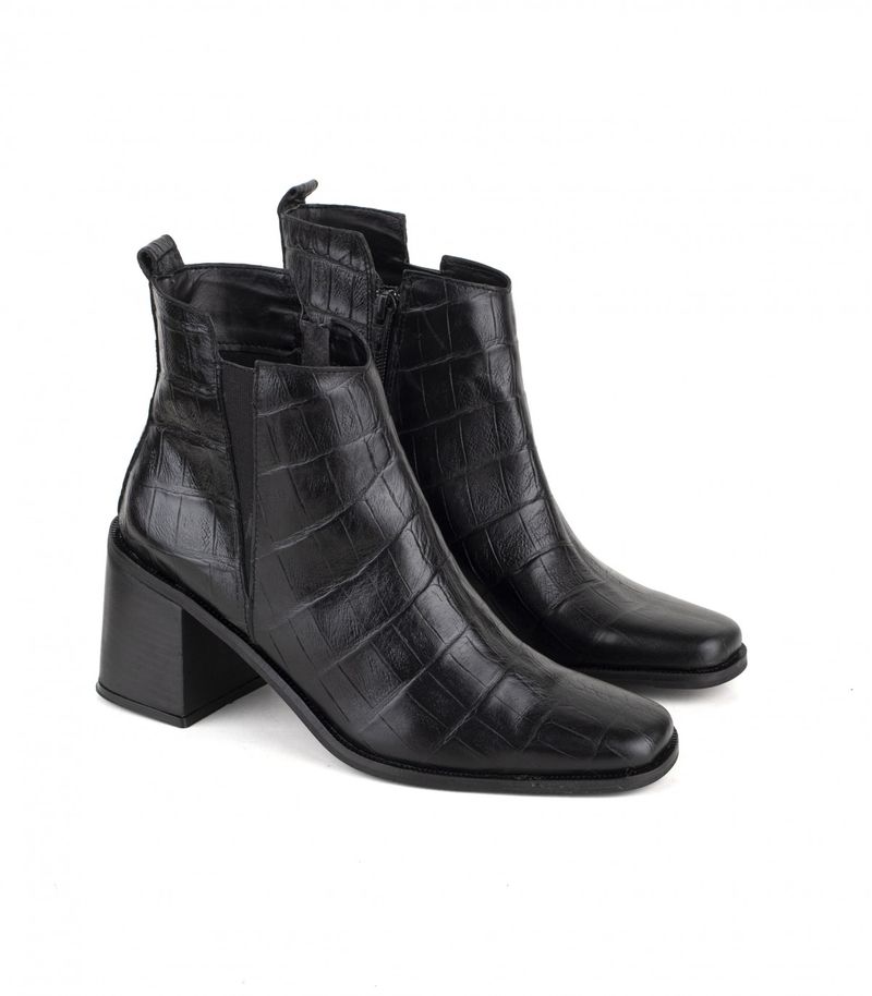 Botas cortas de cuero croco negro con diseño elegante y sofisticado. Perfectas para vestir con estilo, destacan por su acabado único y detalles de alta calidad. Una opción moderna y exclusiva para ocasiones especiales.