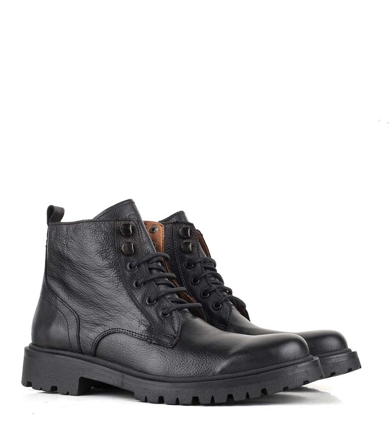 Los borcegos acordonados de cuero negro son calzado resistente con caña alta, cordones para un ajuste seguro y una suela gruesa que brinda comodidad. Son ideales para uso urbano o laboral, combinando durabilidad y estilo.