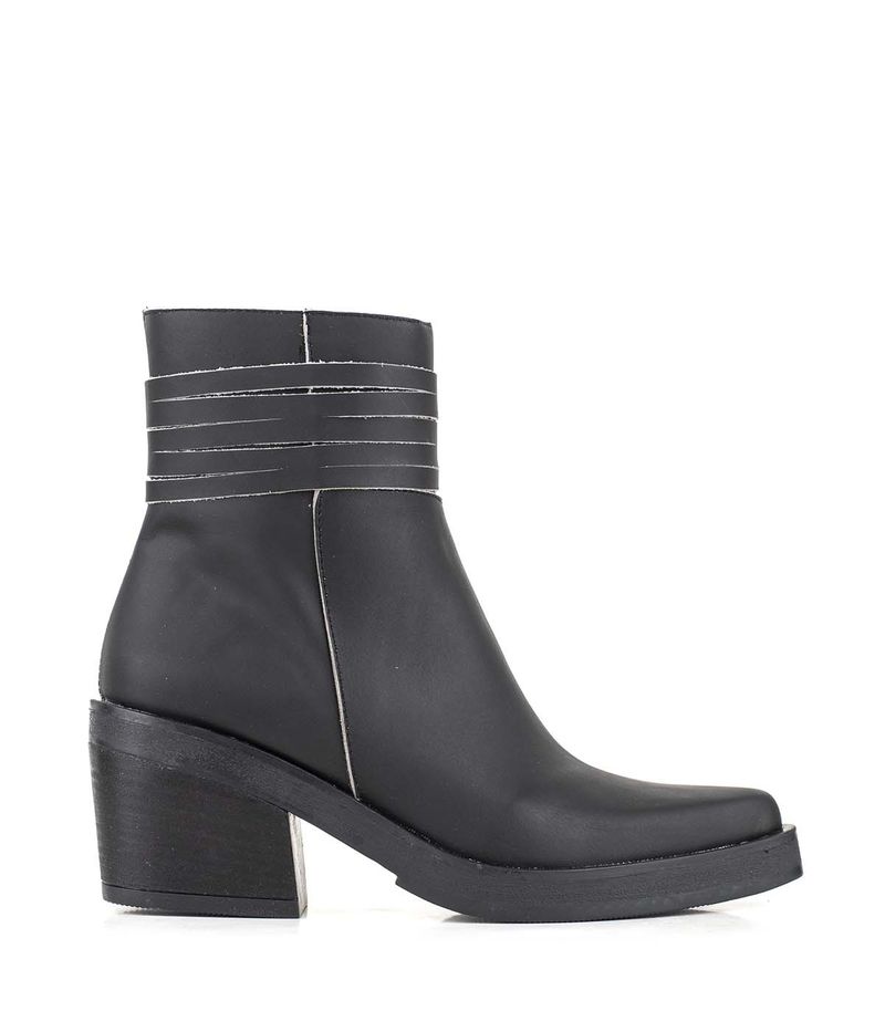Botas de caña media en cuero negro, elegantes y versátiles. Su diseño con tiras agrega un toque distintivo, mientras que la terminación en punta estiliza el calce. Cuentan con una base de goma y un taco separado cómodo, brindando estabilidad y confort en cada paso. Perfectas para un look sofisticado y moderno en cualquier ocasión.