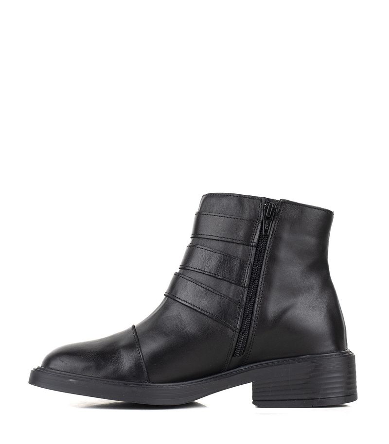 Botas cortas de cuero negro con hebillas, clásicas y elegantes. Con taco bajo y base de goma antideslizante, ofrecen comodidad y seguridad. Sus cuatro tiras con hebilla aportan un detalle distintivo, haciendo de este diseño una opción versátil y muy bella para cualquier ocasión.