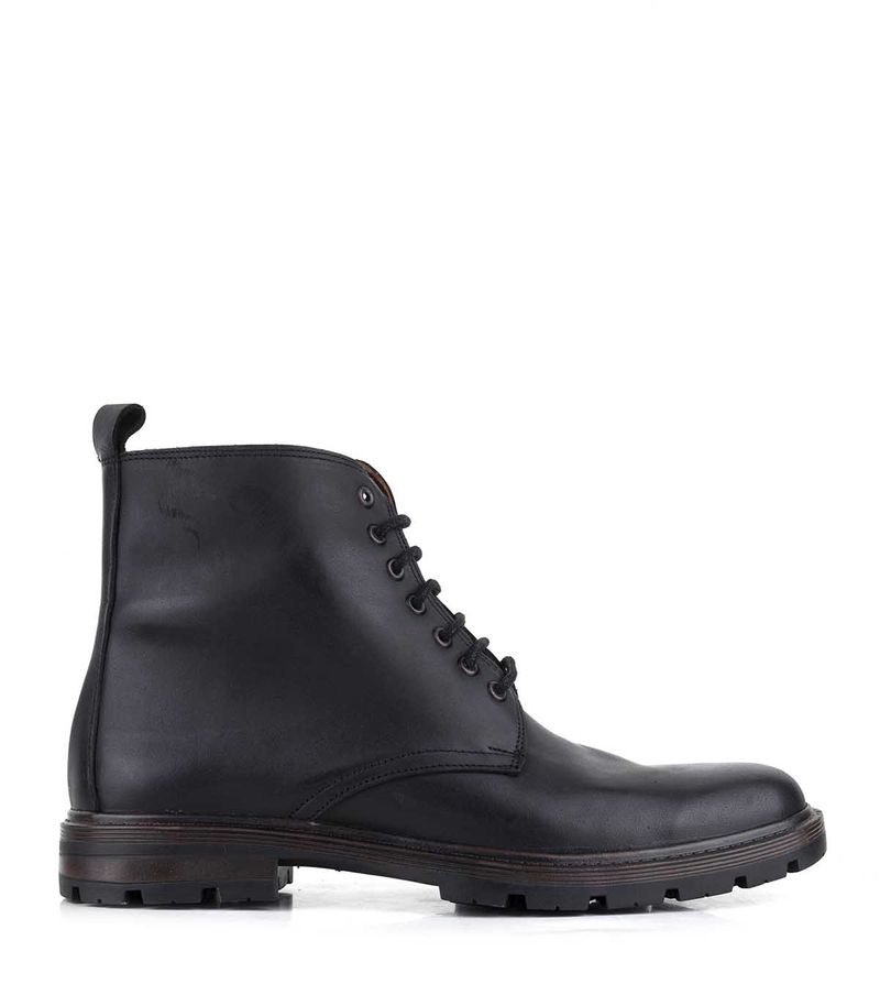Borcego de hombre confeccionado en cuero negro de excelente calidad, con diseño clásico y minimalista. Forrado en cuero, ofrece confort y durabilidad para el uso diario.Cuenta con acceso mediante cordones y cierre lateral, lo que facilita el calce. Su base de goma antideslizante y resistente asegura una pisada firme, con una plataforma de 2,5 cm que brinda comodidad y estabilidad.