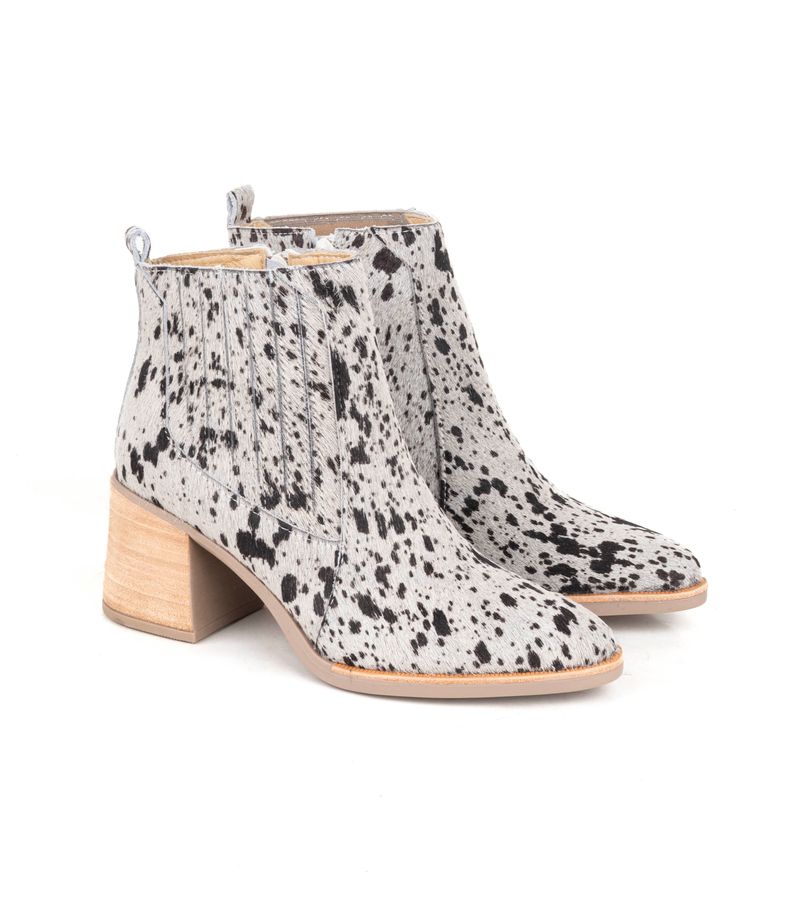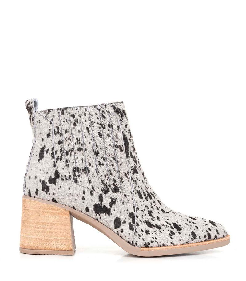 Bota corta confeccionada en cuero fantasía con textura símil pelo, estilo cowprint. Se accede mediante cierre interno y cuenta con elástico en el tobillo para un mejor ajuste. Base de goma y taco folia forrado símil madera, con una altura de 6 cm. Ideal para elevar tus looks con un diseño moderno y original.