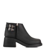 Bota corta de cuero con diseño moderno y femenino. Presenta hebillas decorativas que aportan carácter al modelo y cierre lateral que facilita el calce. Su taco ancho brinda estabilidad y comodidad, ideal para el uso diario combinando estilo y confort.
