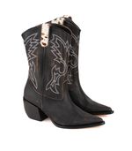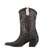 Bota texana media de cuero con diseño clásico de inspiración western. Su capellada presenta bordados en contraste que resaltan el estilo tradicional del modelo. La caña media con tirador facilita el calce, mientras que la punta levemente afinada y el taco medio aportan una silueta elegante. La suela está pensada para absorber el impacto, brindando comodidad y estabilidad, ideal para acompañar jornadas largas sin resignar estilo.
