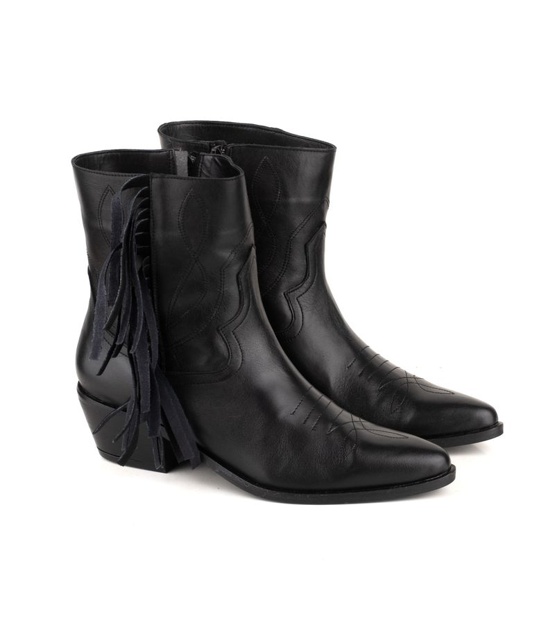 Bota texana corta de cuero con un diseño que combina estilo western y personalidad. Presenta bordados decorativos en la capellada y flecos laterales que aportan movimiento y un detalle distintivo. El cierre lateral facilita el calce, mientras que el taco bajo ancho brinda estabilidad y comodidad al caminar. Su suela está pensada para absorber el impacto, ideal para acompañar jornadas largas o sumar comodidad extra en el día a día.
