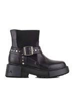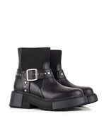 Botas cortas de cuero negro con elástico y hebilla, modernas y versátiles. Su plataforma liviana brinda comodidad, mientras que la tira con hebilla y tachas añade un toque chic. Con punta redonda y puño de elástico, combinan estilo y practicidad para un look sofisticado y urbano.