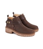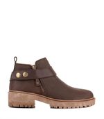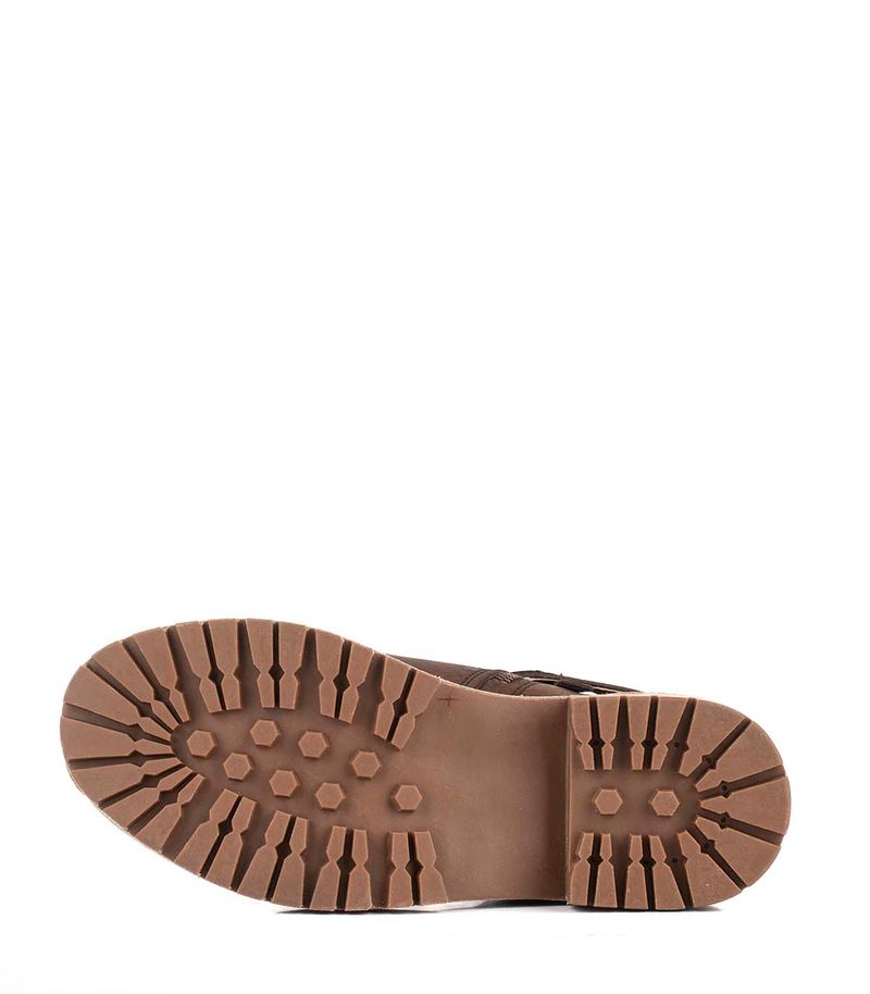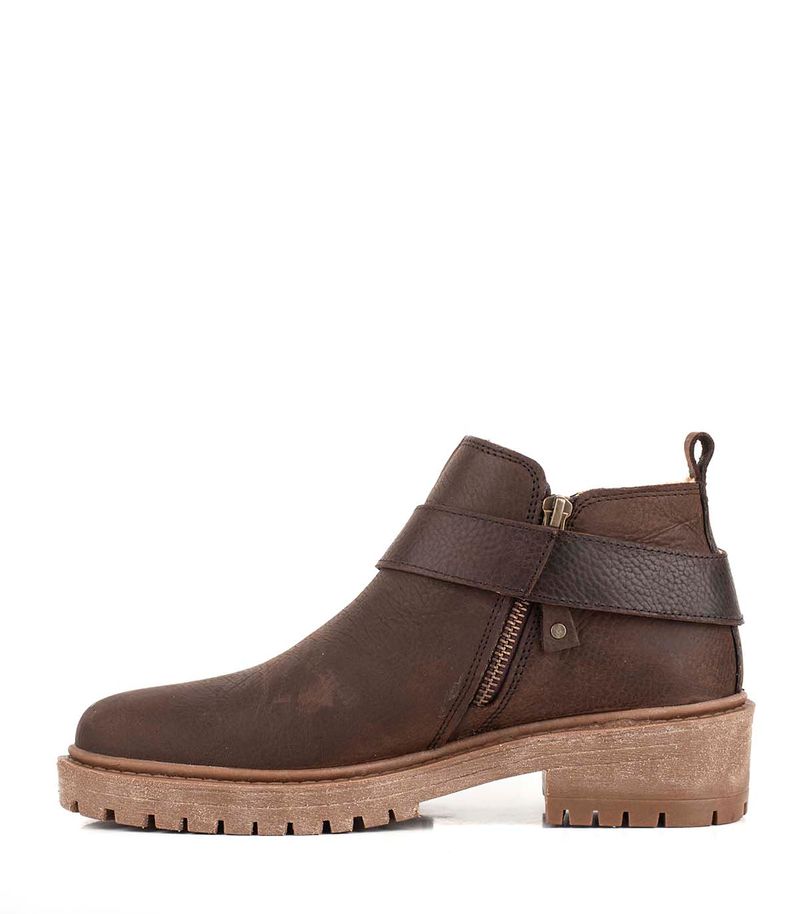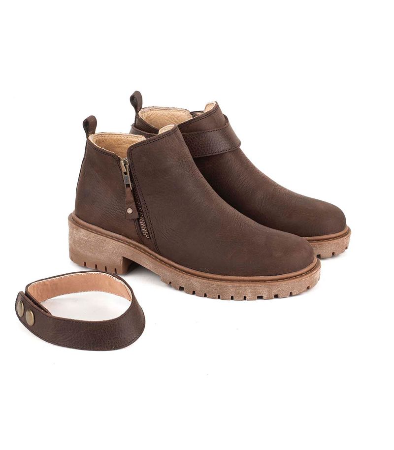 Botas cortas confeccionadas en cuero con diseño clásico y robusto. Presentan tira decorativa con herrajes metálicos en el tobillo y cierre lateral que facilita el calce. Base firme con taco bajo y suela dentada que aporta estabilidad y buen agarre. Un modelo cómodo, resistente y versátil para el uso diario.