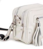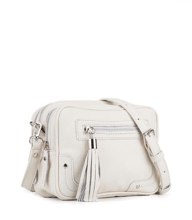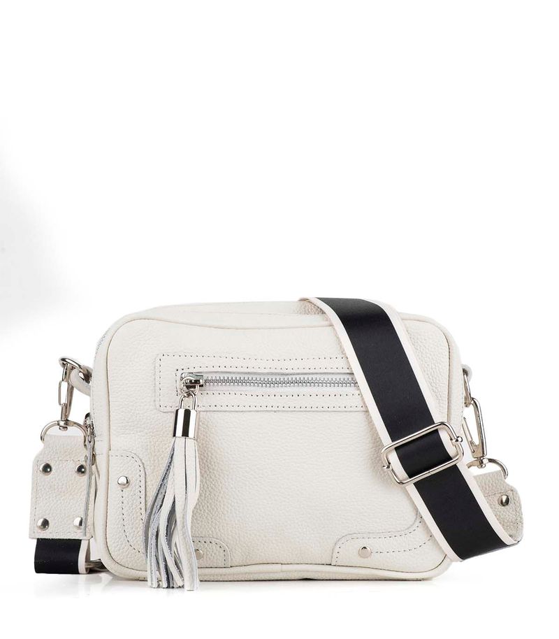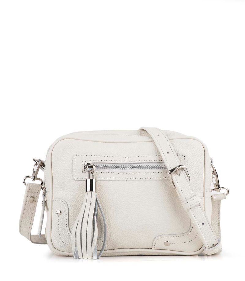 Cartera confeccionada en cuero graneado de alta calidad, con diseño compacto y funcional. Cuenta con cierre superior y bolsillo frontal con cierre metálico y fleco decorativo. Incluye correa regulable para llevar al hombro o cruzada. Un modelo versátil y elegante, ideal para acompañar looks urbanos y de uso diario.