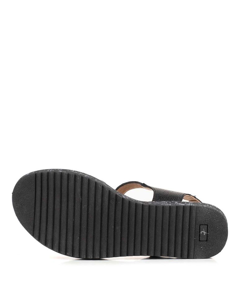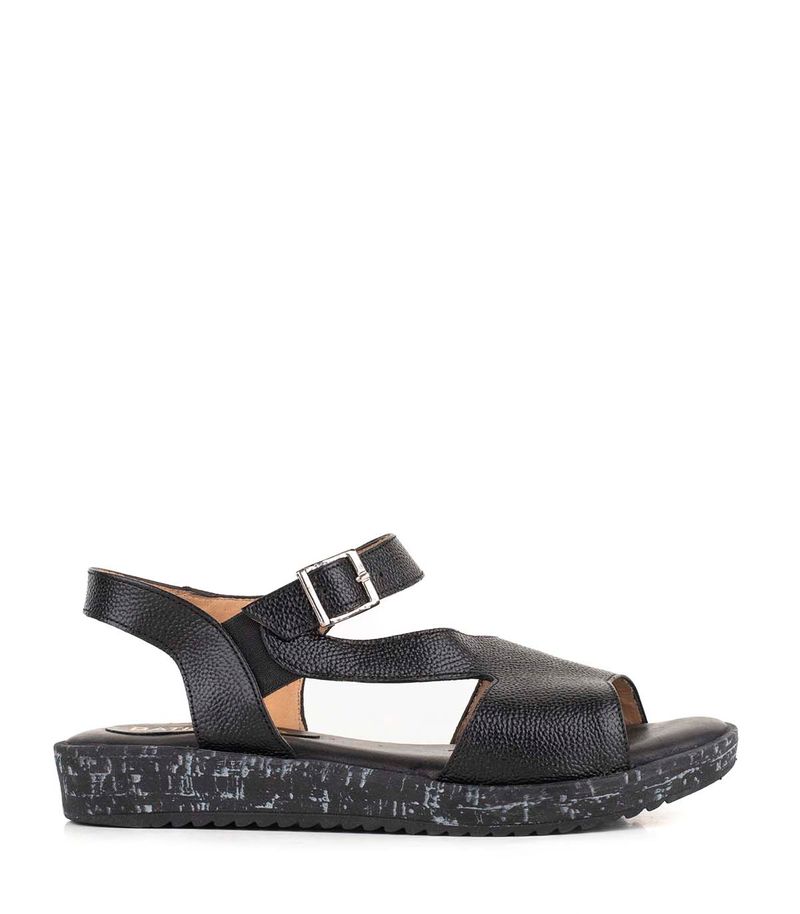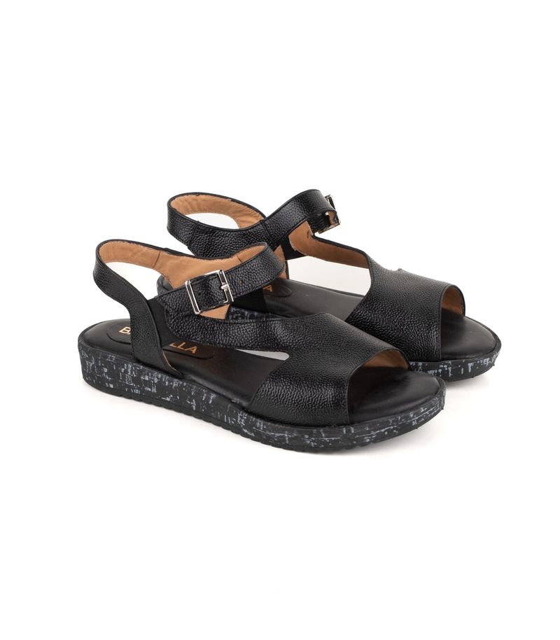 Sandalia confeccionada en cuero graneado, con base baja y cierre de hebilla ajustable. Ofrece comodidad y sujeción para todos los días.