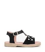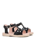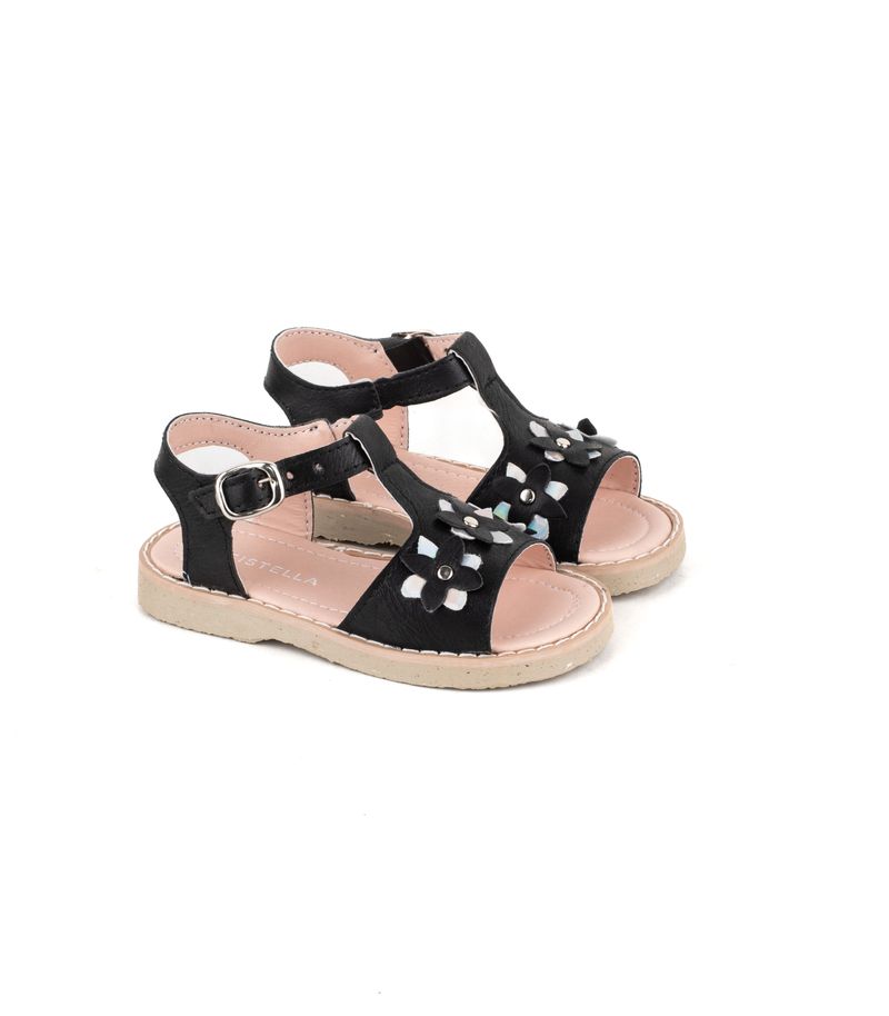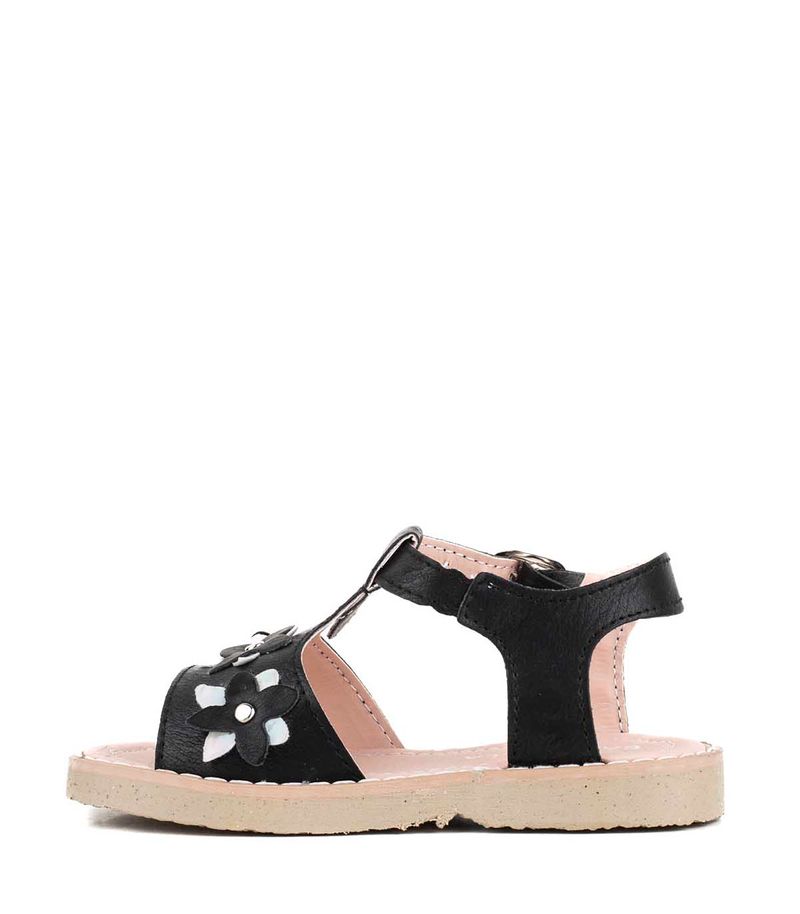Sandalia infantil simil cuero con diseño floral aplicado, cómoda y liviana para todo el día. Hebilla regulable para un calce seguro.