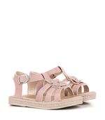 Sandalia infantil simil cuero, con apliques de flores y hebilla lateral. Suela con terminación tipo yute, cómoda y liviana.