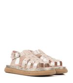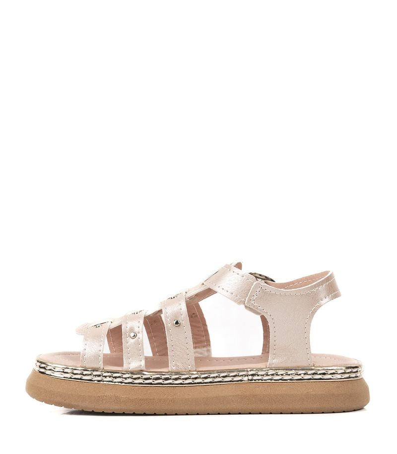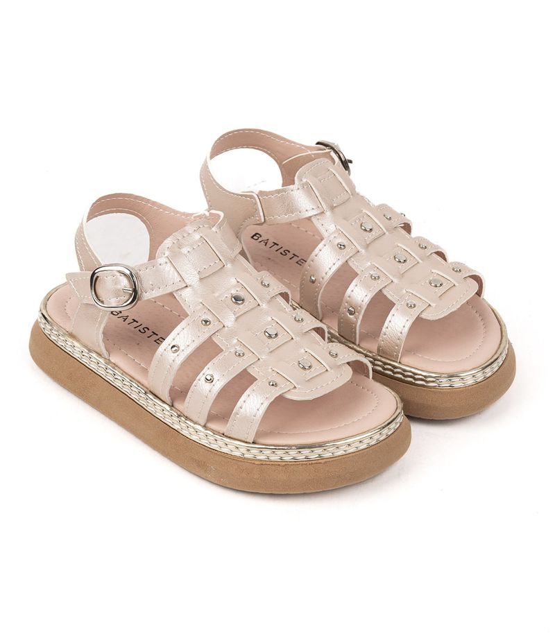 Sandalia infantil simil cuero con diseño de tiras múltiples y apliques de tachas. Suela liviana con detalles en relieve y hebilla regulable para mejor ajuste.