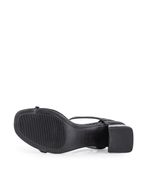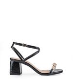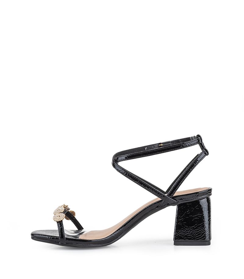 Sandalia simil cuero con taco medio y tiras finas con apliques de strass. Un diseño elegante y cómodo, ideal para eventos o para elevar tus looks de verano.