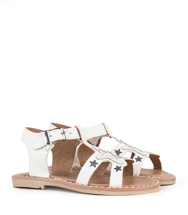 Sandalia de niña en simil cuero, con diseño de estrellas aplicadas y cierre con hebilla para un ajuste seguro. Cómoda y divertida para uso diario.