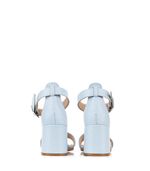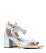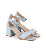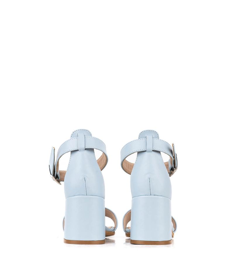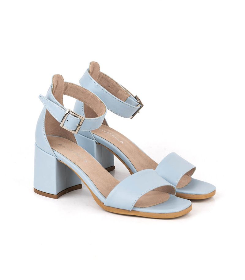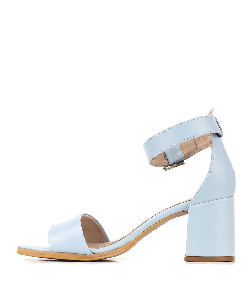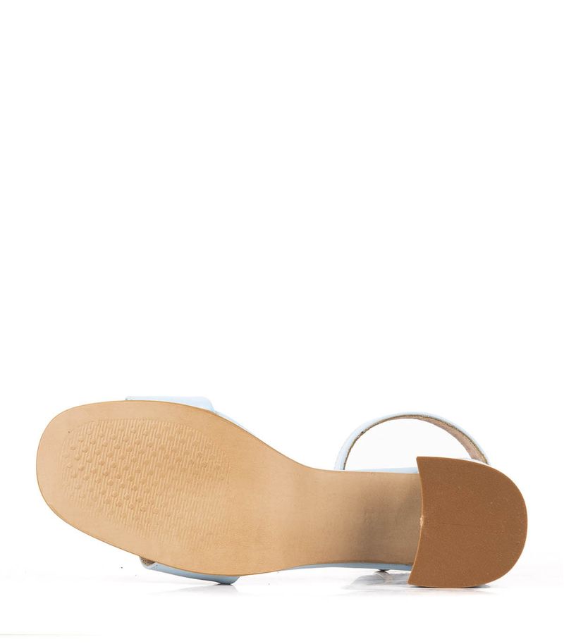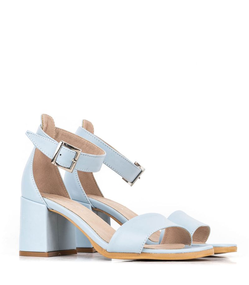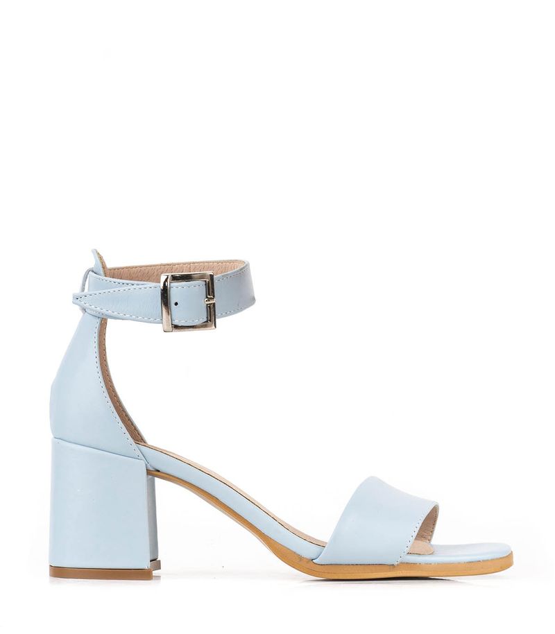 Sandalias confeccionadas en cuero celeste. Su modelo de una tira con pulsera en el tobillo las hace una opción fresca y elegante que depende con que las combines funcionan de día de y de noche. Están forradas en cuero y la base es de suela natural. El taco ancho mide aproximadamente 7cms. La hebilla es plateada y la tira regulable. Ideales para un look muy natural!